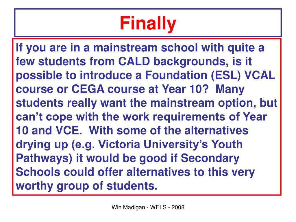 Finally If you are in a mainstream school with quite a few students from CALD backgrounds, is it possible to introduce a Foundation (ESL) VCAL course or CEGA course at Year 10? Many students really want the mainstream option, but can’t cope with the work requirements of Year 10 and VCE. With some of the alternatives drying up (e.g. Victoria University’s Youth Pathways) it would be good if Secondary Schools could offer alternatives to this very worthy group of students. Win Madigan - WELS - 2008