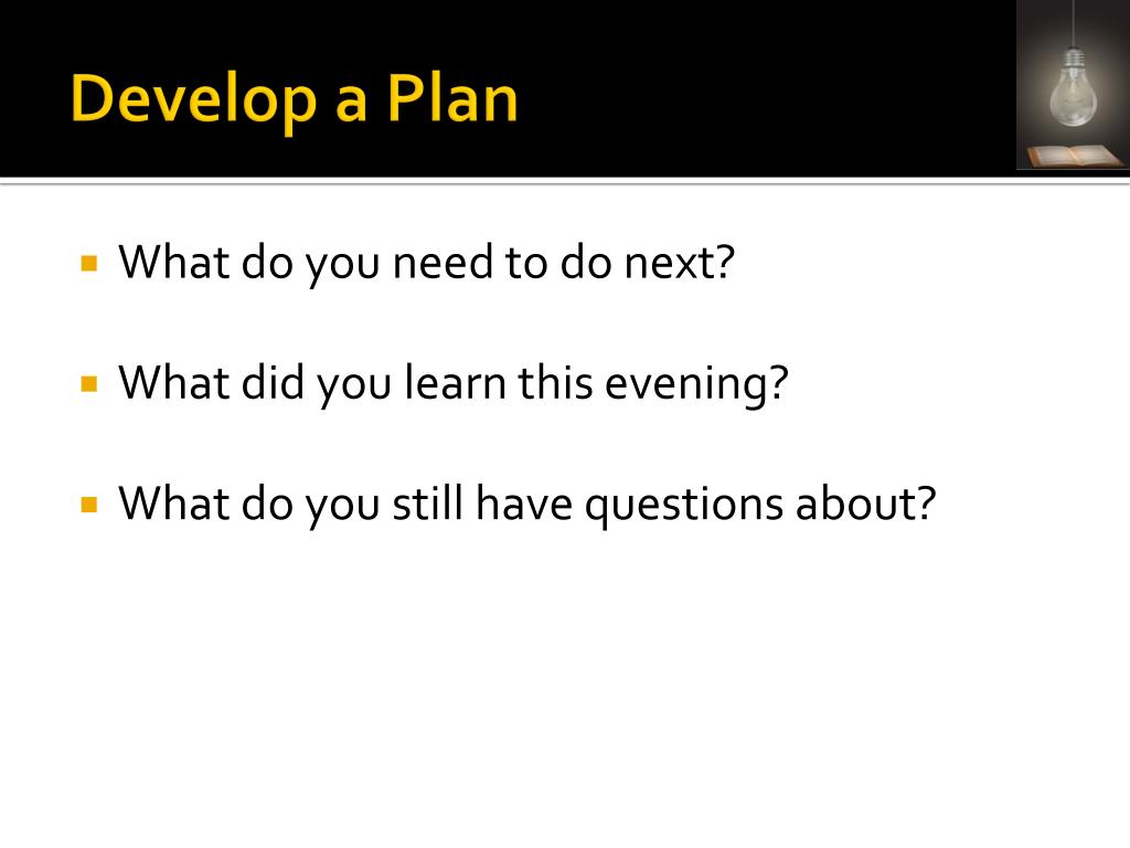 Develop a Plan • What do you need to do next? • What did you learn this evening? • What do you still have questions about?