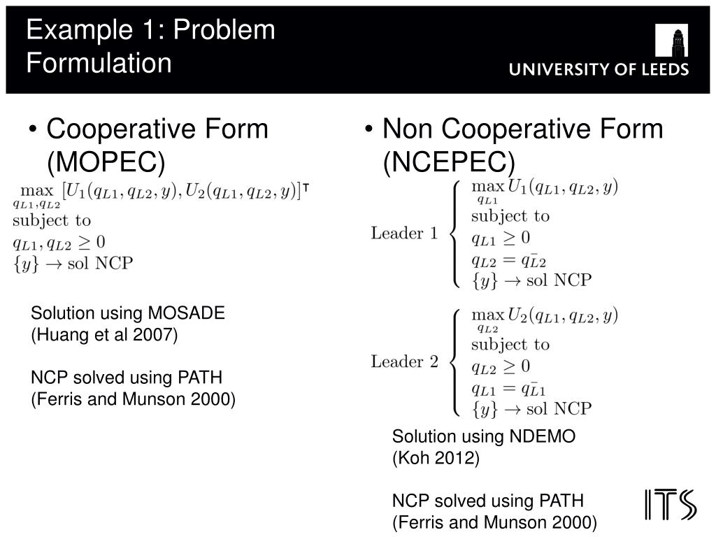 Example 1: Problem Formulation • Cooperative Form (MOPEC) • Non Cooperative Form (NCEPEC) Solution using MOSADE (Huang et al 2007) NCP solved using PATH (Ferris and Munson 2000) Solution using NDEMO (Koh 2012) NCP solved using PATH (Ferris and Munson 2000)