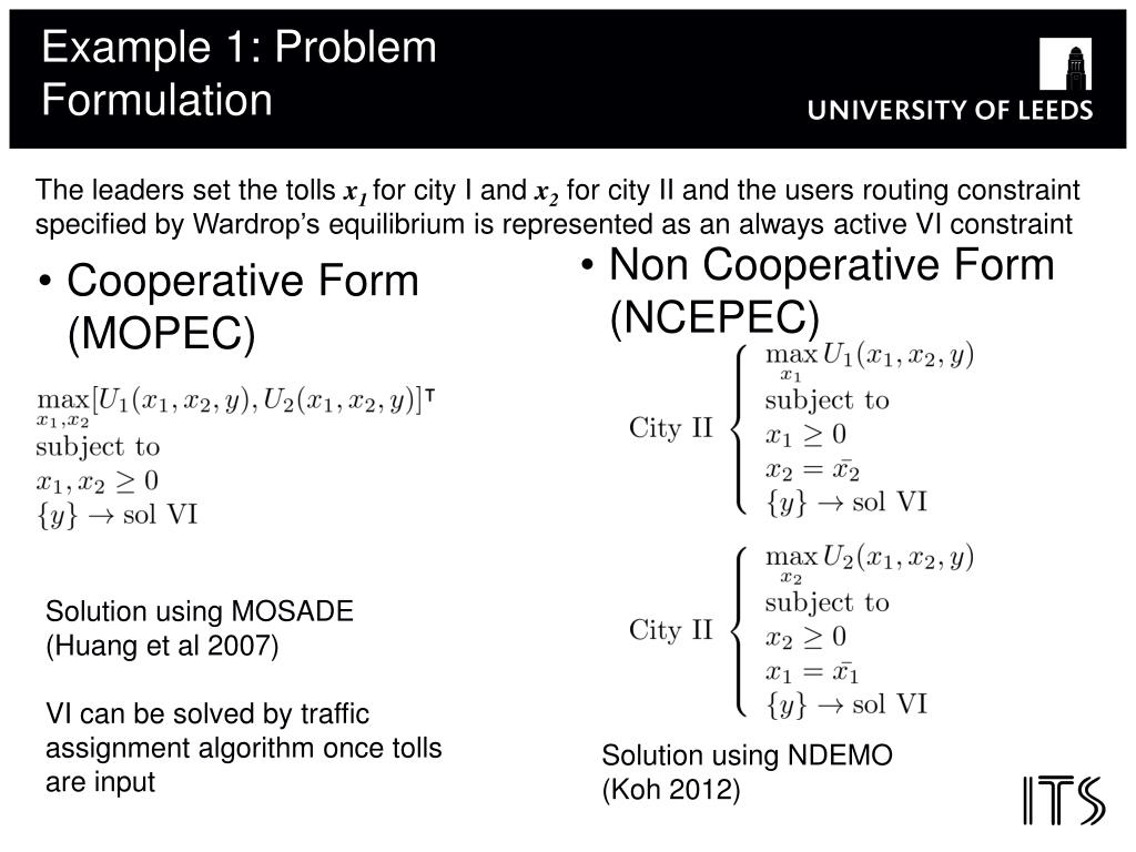 Example 1: Problem Formulation The leaders set the tolls x1 for city I and x2 for city II and the users routing constraint specified by Wardrop’s equilibrium is represented as an always active VI constraint • Cooperative Form (MOPEC) • Non Cooperative Form (NCEPEC) Solution using MOSADE (Huang et al 2007) VI can be solved by traffic assignment algorithm once tolls are input Solution using NDEMO (Koh 2012)