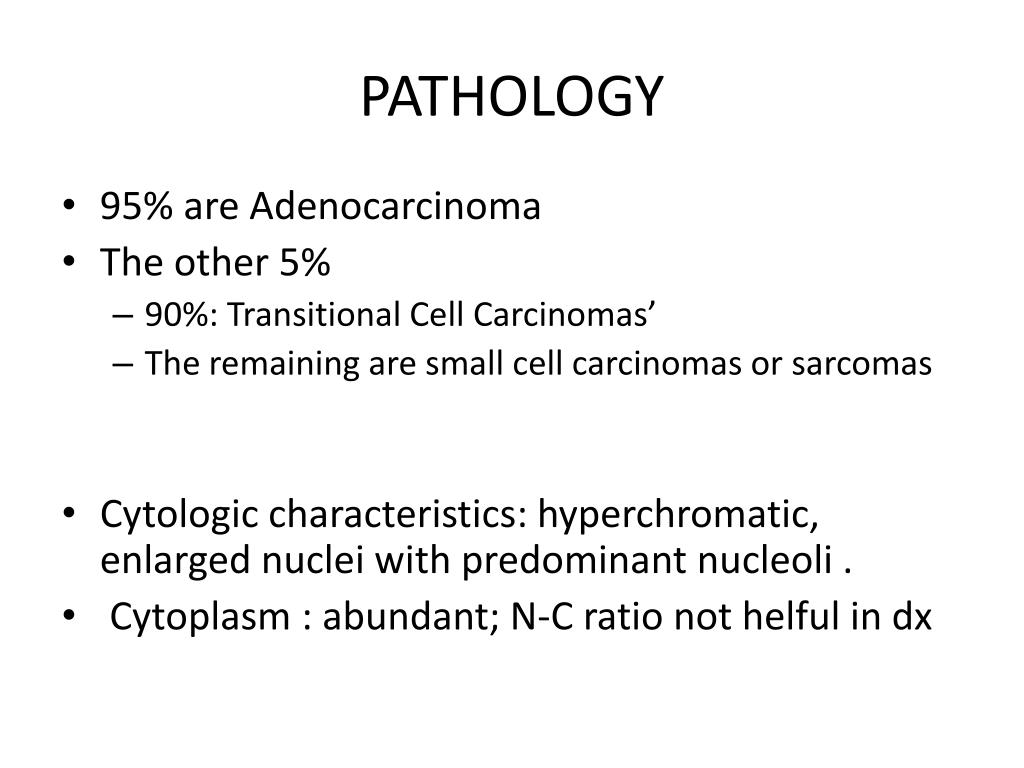PATHOLOGY • 95% are Adenocarcinoma • The other 5% • 90%: Transitional Cell Carcinomas’ • The remaining are small cell carcinomas or sarcomas • Cytologic characteristics: hyperchromatic, enlarged nuclei with predominant nucleoli . • Cytoplasm : abundant; N-C ratio not helful in dx