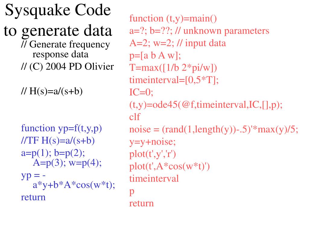 function (t,y)=main() a=?; b=??; // unknown parameters A=2; w=2; // input data p=[a b A w]; T=max([1/b 2*pi/w]) timeinterval=[0,5*T]; IC=0; (t,y)=ode45(@f,timeinterval,IC,[],p); clf noise = (rand(1,length(y))-.5)'*max(y)/5; y=y+noise; plot(t',y','r') plot(t',A*cos(w*t)') timeinterval p return Sysquake Code to generate data // Generate frequency response data // (C) 2004 PD Olivier // H(s)=a/(s+b) function yp=f(t,y,p) //TF H(s)=a/(s+b) a=p(1); b=p(2); A=p(3); w=p(4); yp = -a*y+b*A*cos(w*t); return