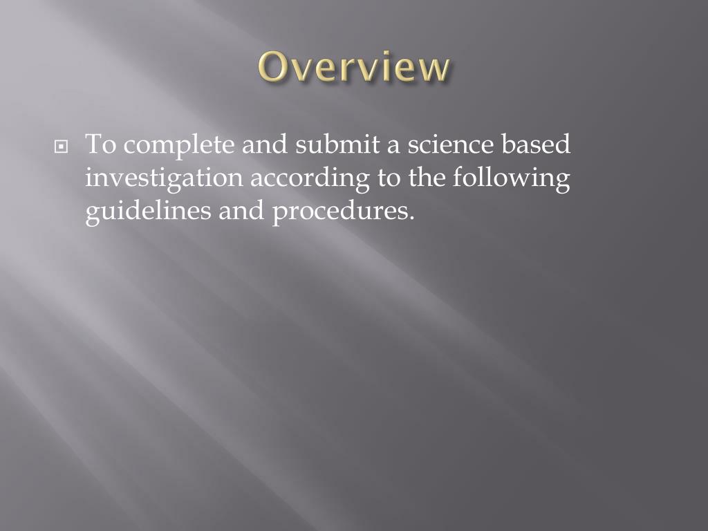Overview • To complete and submit a science based investigation according to the following guidelines and procedures.