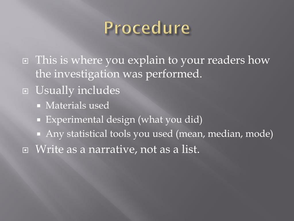 Procedure • This is where you explain to your readers how the investigation was performed. • Usually includes • Materials used • Experimental design (what you did) • Any statistical tools you used (mean, median, mode) • Write as a narrative, not as a list.