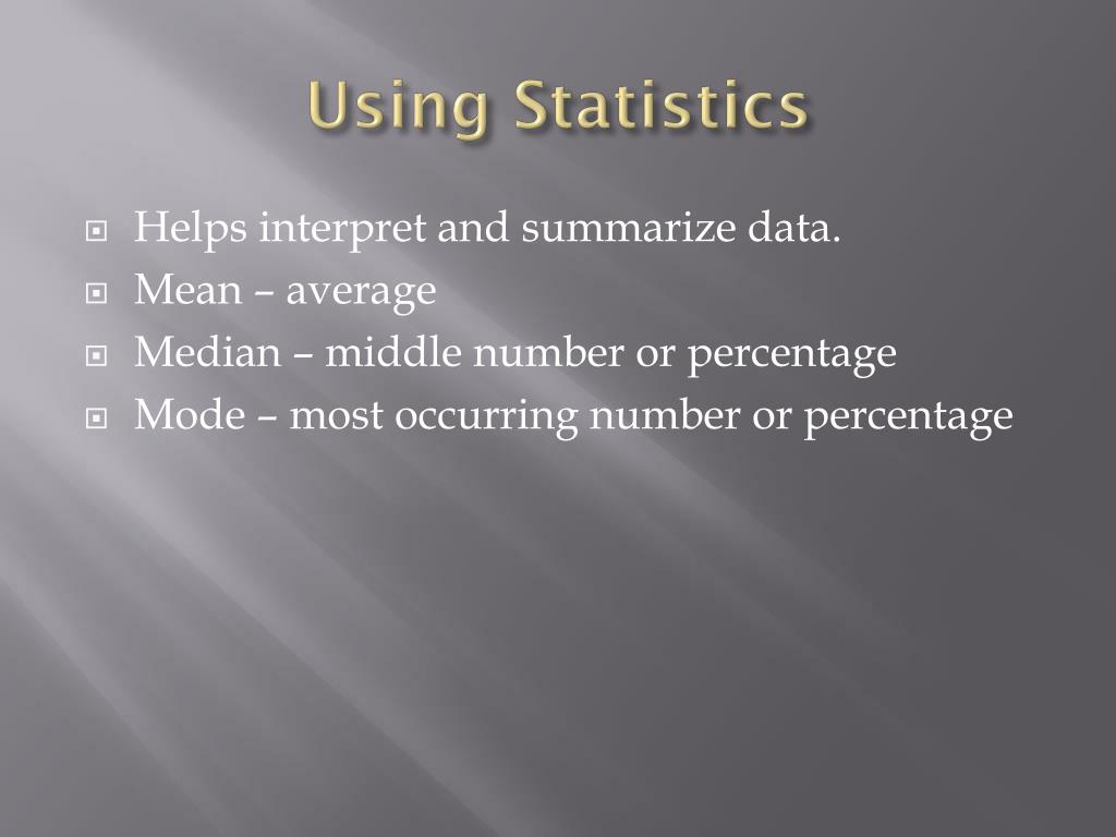 Using Statistics • Helps interpret and summarize data. • Mean – average • Median – middle number or percentage • Mode – most occurring number or percentage