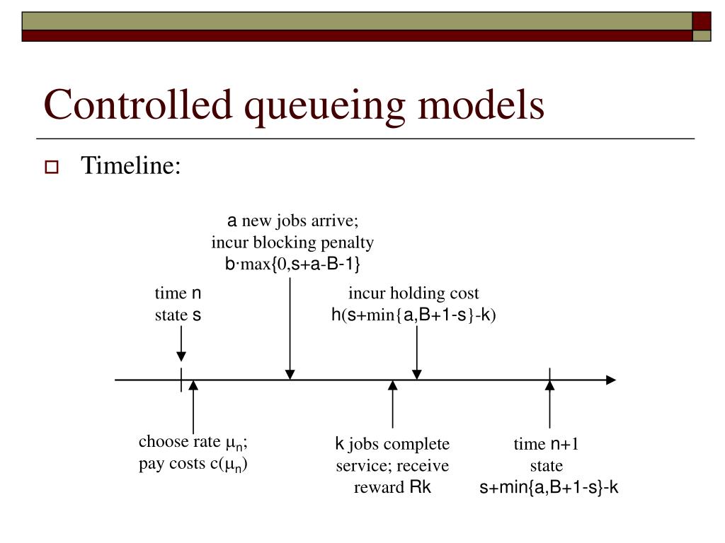 Controlled queueing models • Timeline: a new jobs arrive; incur blocking penalty b∙max{0,s+a-B-1} time n state s incur holding cost h(s+min{a,B+1-s}-k) choose rate n; pay costs c(n) k jobs complete service; receive reward Rk time n+1 state s+min{a,B+1-s}-k