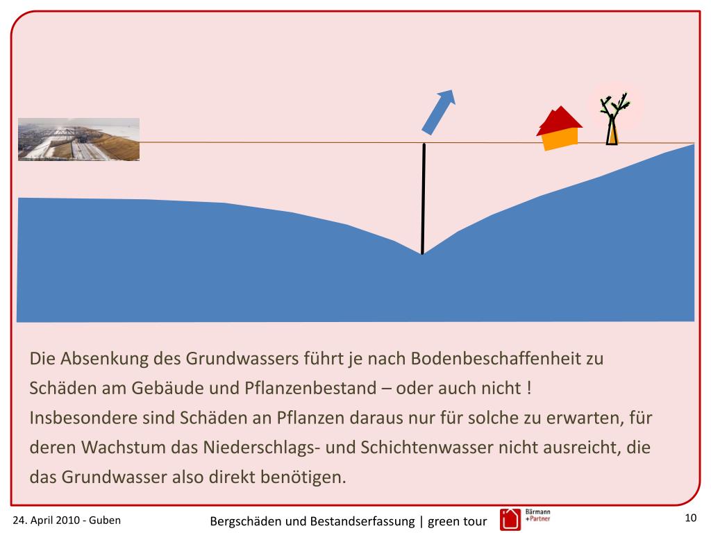 Die Absenkung des Grundwassers führt je nach Bodenbeschaffenheit zu Schäden am Gebäude und Pflanzenbestand – oder auch nicht ! Insbesondere sind Schäden an Pflanzen daraus nur für solche zu erwarten, für deren Wachstum das Niederschlags- und Schichtenwasser nicht ausreicht, die das Grundwasser also direkt benötigen.