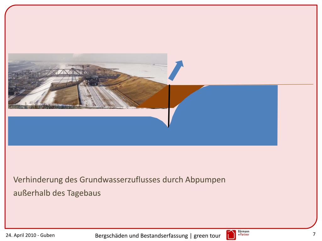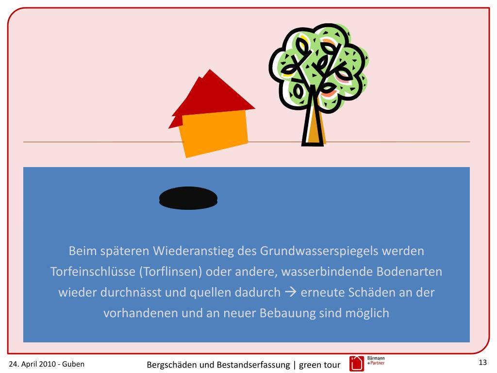 Vielen Dank für Ihre Aufmerksamkeit ! Beim Sinken des Grundwasserspiegels werden Torfeinschlüsse (Torflinsen) oder andere, wasserbindende Bodenarten austrocknen und dadurch schrumpfen Schäden an der Bebauung sind möglich Kontakt: Internet: www.baermann-partner.de E-Mail: office@baermann-partner.de Tel. 03561-2618 Fax 03561-2529