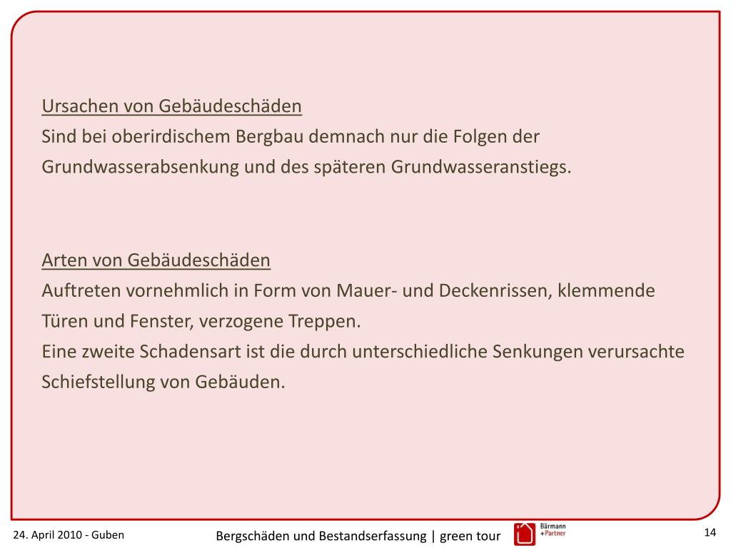 Ursachen von GebäudeschädenSind bei oberirdischem Bergbau demnach nur die Folgen der Grundwasserabsenkung und des späteren Grundwasseranstiegs. Arten von GebäudeschädenAuftreten vornehmlich in Form von Mauer- und Deckenrissen, klemmende Türen und Fenster, verzogene Treppen.Eine zweite Schadensart ist die durch unterschiedliche Senkungen verursachte Schiefstellung von Gebäuden.