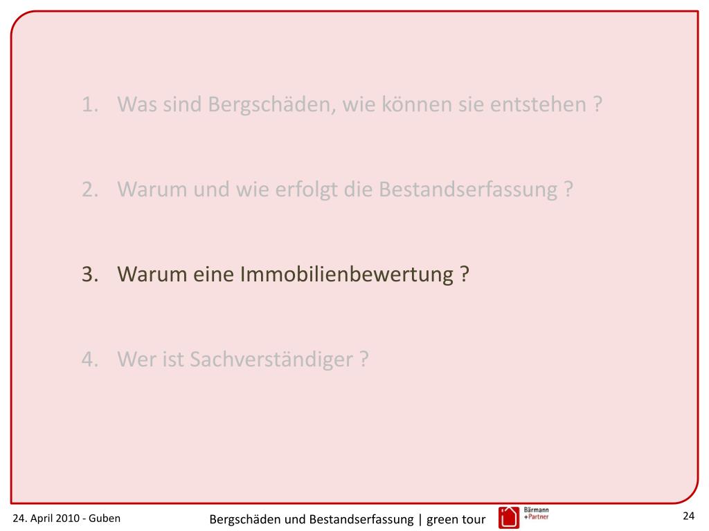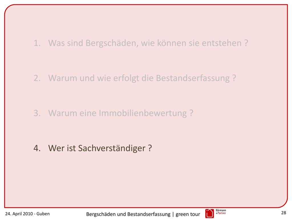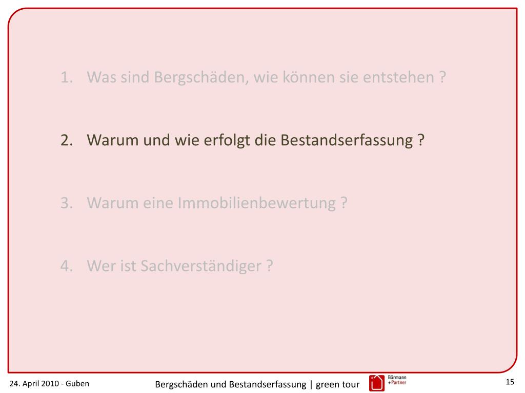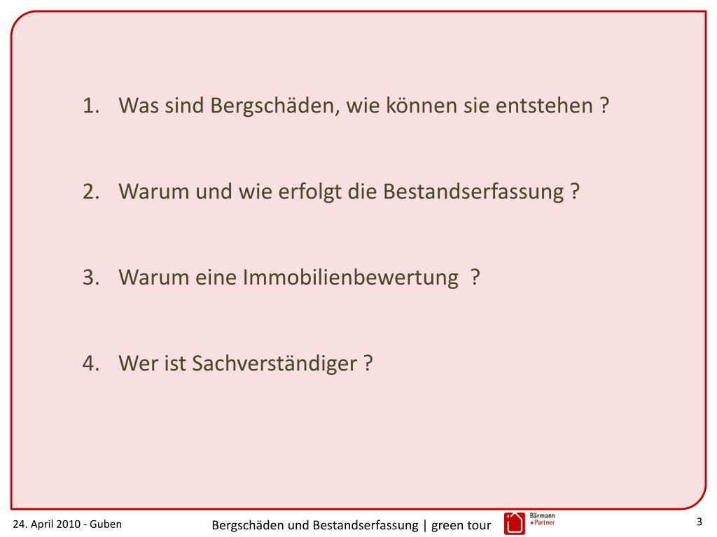 Was sind Bergschäden, wie können sie entstehen ? • Warum und wie erfolgt die Bestandserfassung ? • Warum eine Immobilienbewertung ? • Wer ist Sachverständiger ?