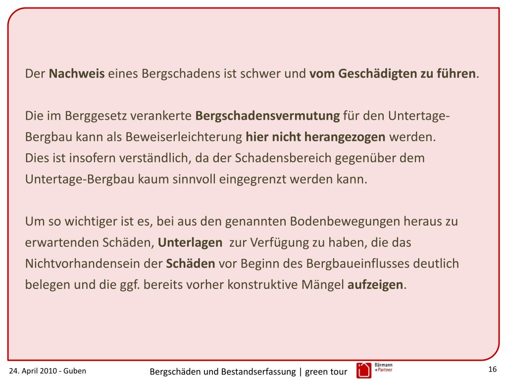 Der Nachweis eines Bergschadens ist schwer und vom Geschädigten zu führen.Die im Berggesetz verankerte Bergschadensvermutung für den Untertage-Bergbau kann als Beweiserleichterung hier nicht herangezogen werden.Dies ist insofern verständlich, da der Schadensbereich gegenüber dem Untertage-Bergbau kaum sinnvoll eingegrenzt werden kann.Um so wichtiger ist es, bei aus den genannten Bodenbewegungen heraus zu erwartenden Schäden, Unterlagen zur Verfügung zu haben, die das Nichtvorhandensein der Schäden vor Beginn des Bergbaueinflusses deutlich belegen und die ggf. bereits vorher konstruktive Mängel aufzeigen.