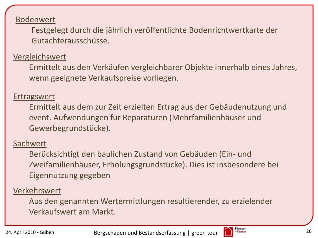 BodenwertFestgelegt durch die jährlich veröffentlichte Bodenrichtwertkarte der Gutachterausschüsse. VergleichswertErmittelt aus den Verkäufen vergleichbarer Objekte innerhalb eines Jahres, wenn geeignete Verkaufspreise vorliegen. ErtragswertErmittelt aus dem zur Zeit erzielten Ertrag aus der Gebäudenutzung und event. Aufwendungen für Reparaturen (Mehrfamilienhäuser und Gewerbegrundstücke). SachwertBerücksichtigt den baulichen Zustand von Gebäuden (Ein- und Zweifamilienhäuser, Erholungsgrundstücke). Dies ist insbesondere bei Eigennutzung gegeben VerkehrswertAus den genannten Wertermittlungen resultierender, zu erzielender Verkaufswert am Markt.