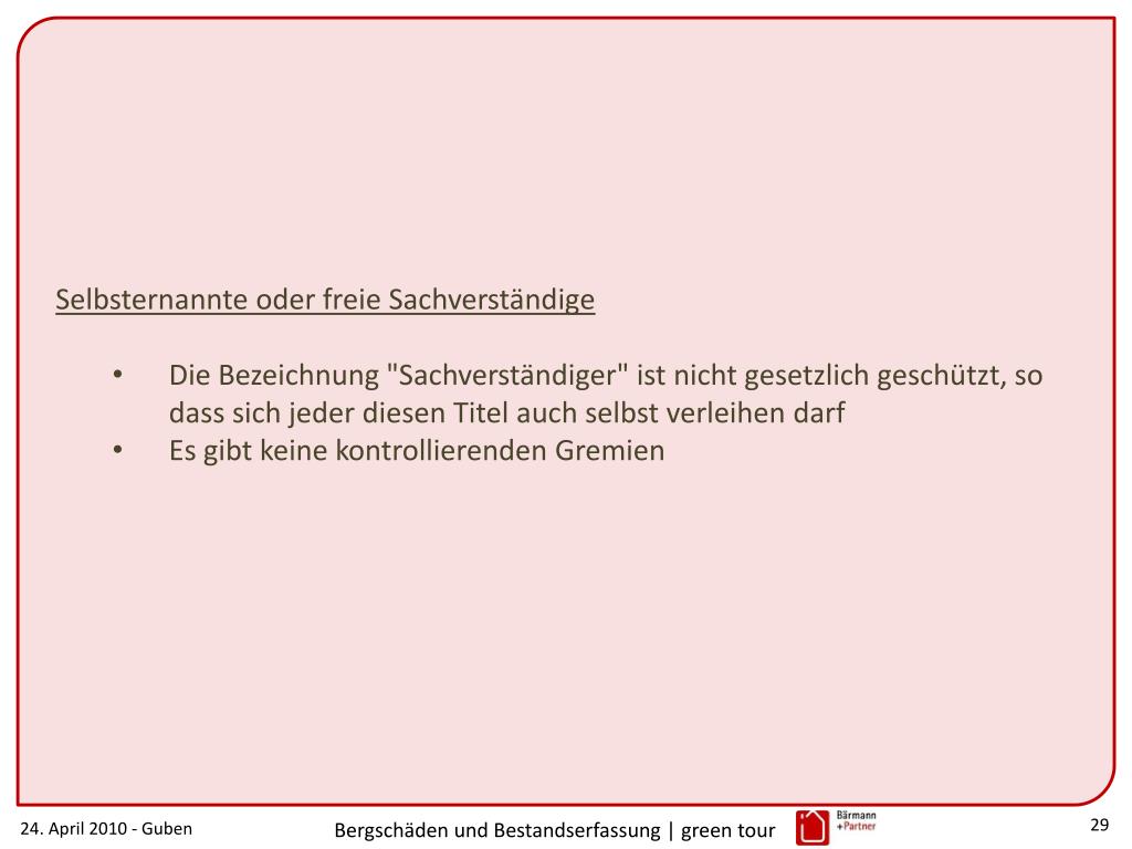 Selbsternannte oder freie Sachverständige • Die Bezeichnung "Sachverständiger" ist nicht gesetzlich geschützt, so dass sich jeder diesen Titel auch selbst verleihen darf • Es gibt keine kontrollierenden Gremien