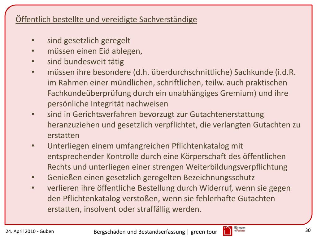 Öffentlich bestellte und vereidigte Sachverständige • sind gesetzlich geregelt • müssen einen Eid ablegen, • sind bundesweit tätig • müssen ihre besondere (d.h. überdurchschnittliche) Sachkunde (i.d.R. im Rahmen einer mündlichen, schriftlichen, teilw. auch praktischen Fachkundeüberprüfung durch ein unabhängiges Gremium) und ihre persönliche Integrität nachweisen • sind in Gerichtsverfahren bevorzugt zur Gutachtenerstattung heranzuziehen und gesetzlich verpflichtet, die verlangten Gutachten zu erstatten • Unterliegen einem umfangreichen Pflichtenkatalog mit entsprechender Kontrolle durch eine Körperschaft des öffentlichen Rechts und unterliegen einer strengen Weiterbildungsverpflichtung • Genießen einen gesetzlich geregelten Bezeichnungsschutz • verlieren ihre öffentliche Bestellung durch Widerruf, wenn sie gegen den Pflichtenkatalog verstoßen, wenn sie fehlerhafte Gutachten erstatten, insolvent oder straffällig werden.