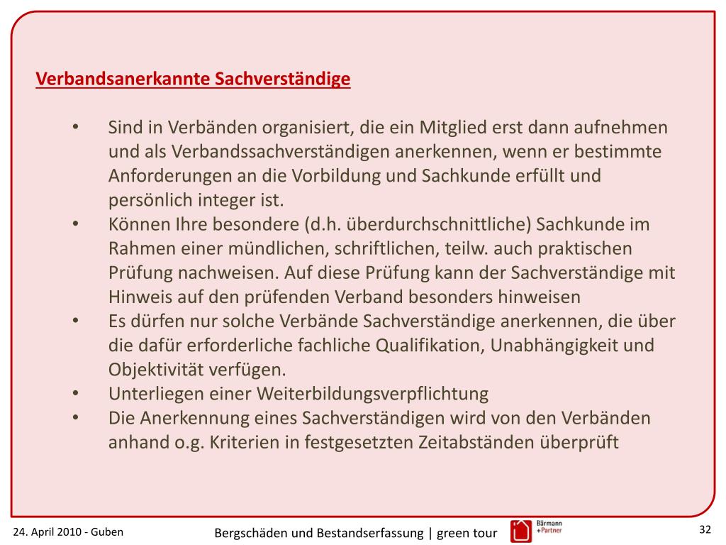 Verbandsanerkannte Sachverständige • Sind in Verbänden organisiert, die ein Mitglied erst dann aufnehmen und als Verbandssachverständigen anerkennen, wenn er bestimmte Anforderungen an die Vorbildung und Sachkunde erfüllt und persönlich integer ist. • Können Ihre besondere (d.h. überdurchschnittliche) Sachkunde im Rahmen einer mündlichen, schriftlichen, teilw. auch praktischen Prüfung nachweisen. Auf diese Prüfung kann der Sachverständige mit Hinweis auf den prüfenden Verband besonders hinweisen • Es dürfen nur solche Verbände Sachverständige anerkennen, die über die dafür erforderliche fachliche Qualifikation, Unabhängigkeit und Objektivität verfügen. • Unterliegen einer Weiterbildungsverpflichtung • Die Anerkennung eines Sachverständigen wird von den Verbänden anhand o.g. Kriterien in festgesetzten Zeitabständen überprüft