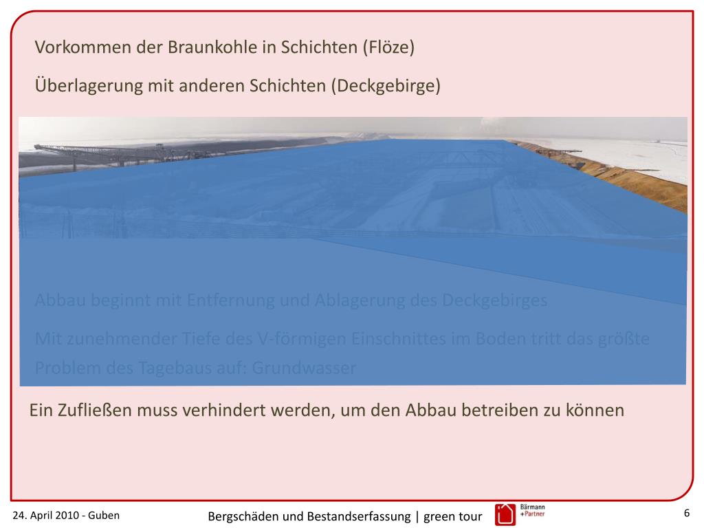 Vorkommen der Braunkohle in Schichten (Flöze) Überlagerung mit anderen Schichten (Deckgebirge) Abbau beginnt mit Entfernung und Ablagerung des Deckgebirges Mit zunehmender Tiefe des V-förmigen Einschnittes im Boden tritt das größte Problem des Tagebaus auf: Grundwasser Ein Zufließen muss verhindert werden, um den Abbau betreiben zu können