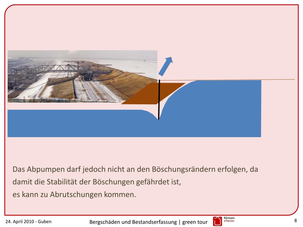 Das Abpumpen darf jedoch nicht an den Böschungsrändern erfolgen, da damit die Stabilität der Böschungen gefährdet ist,es kann zu Abrutschungen kommen.