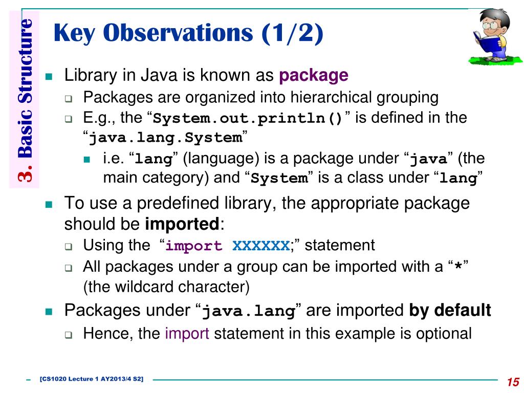 Key Observations (1/2) 3. Basic Structure • Library in Java is known as package • Packages are organized into hierarchical grouping • E.g., the “System.out.println()” is defined in the “java.lang.System” • i.e. “lang” (language) is a package under “java” (the main category) and “System” is a class under “lang” • To use a predefined library, the appropriate package should be imported: • Using the “importXXXXXX;” statement • All packages under a group can be imported with a “*” (the wildcard character) • Packages under “java.lang” are imported by default • Hence, the import statement in this example is optional [CS1020 Lecture 1 AY2013/4 S2]