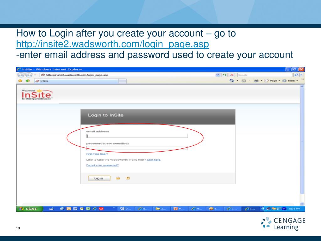 How to Login after you create your account – go to http://insite2.wadsworth.com/login_page.asp-enter email address and password used to create your account