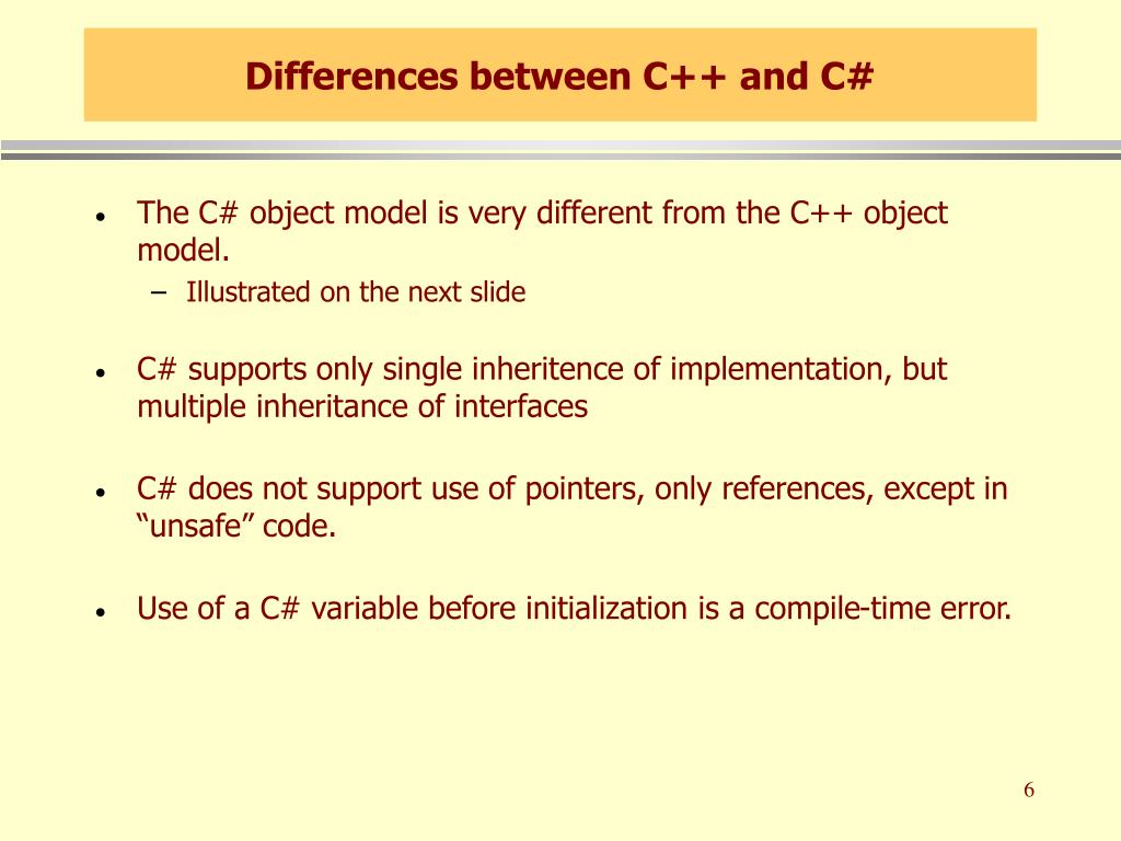 Differences between C++ and C# • The C# object model is very different from the C++ object model. • Illustrated on the next slide • C# supports only single inheritence of implementation, but multiple inheritance of interfaces • C# does not support use of pointers, only references, except in “unsafe” code. • Use of a C# variable before initialization is a compile-time error.