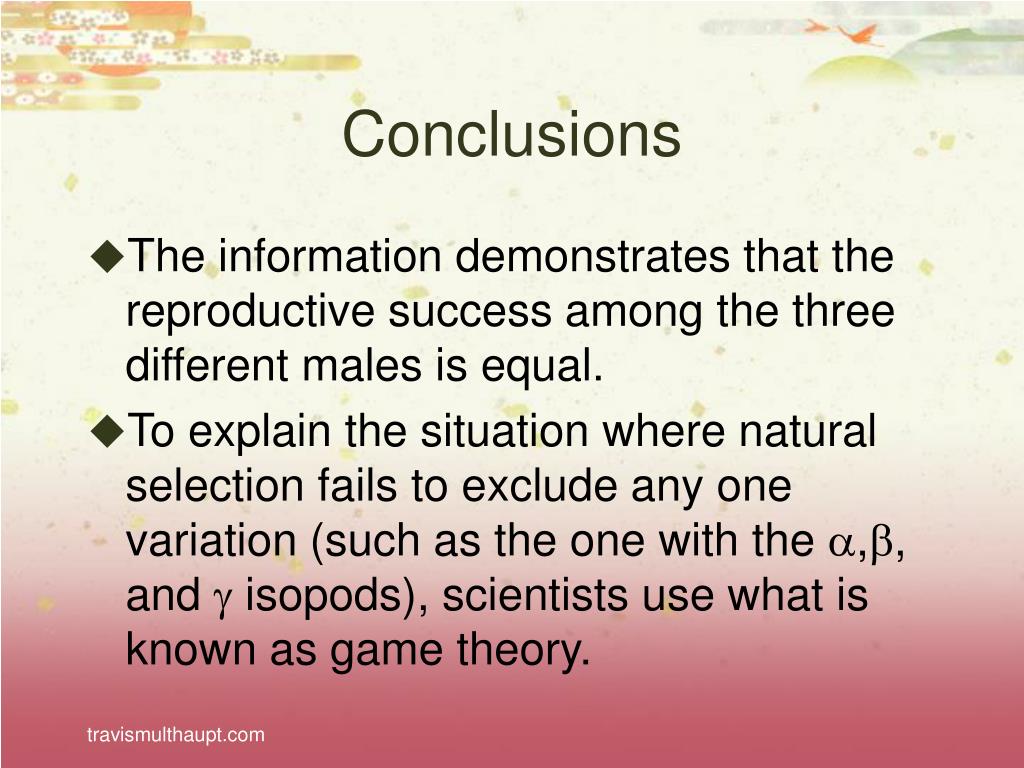Conclusions • The information demonstrates that the reproductive success among the three different males is equal. • To explain the situation where natural selection fails to exclude any one variation (such as the one with the ,, and isopods), scientists use what is known as game theory.