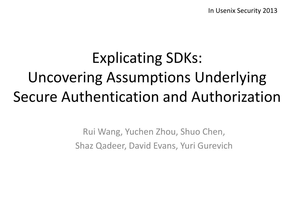 In Usenix Security 2013 Explicating SDKs: Uncovering Assumptions Underlying Secure Authentication and Authorization Rui Wang, Yuchen Zhou, Shuo Chen, ShazQadeer, David Evans, Yuri Gurevich