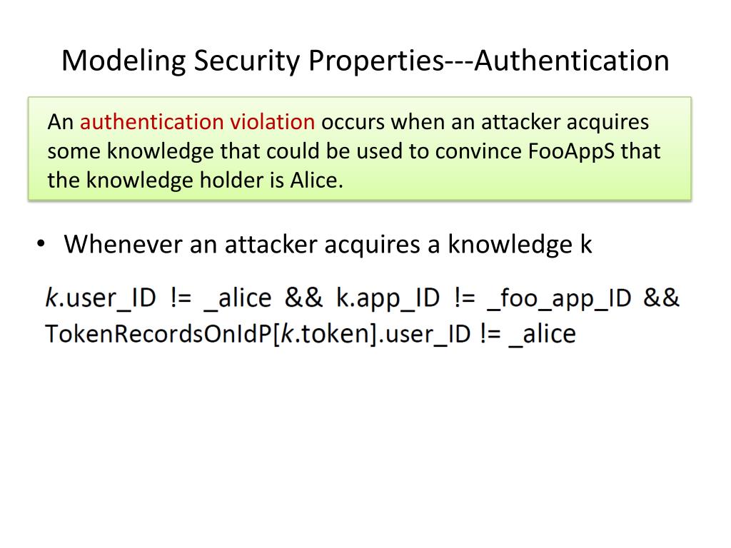 Modeling Security Properties---Authentication An authentication violation occurs when an attacker acquires some knowledge that could be used to convince FooAppS that the knowledge holder is Alice. • Whenever an attacker acquires a knowledge k