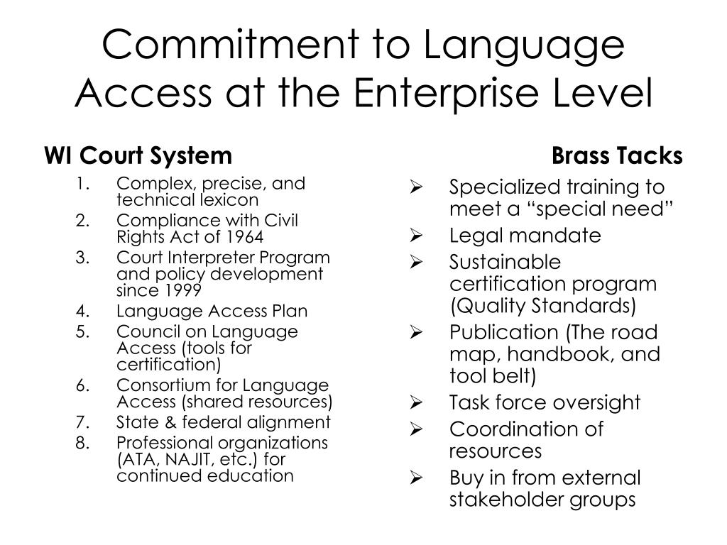 Commitment to Language Access at the Enterprise Level WI Court System Brass Tacks Specialized training to meet a “special need” Legal mandate Sustainable certification program (Quality Standards) Publication (The road map, handbook, and tool belt) Task force oversight Coordination of resources Buy in from external stakeholder groups • Complex, precise, and technical lexicon • Compliance with Civil Rights Act of 1964 • Court Interpreter Program and policy development since 1999 • Language Access Plan • Council on Language Access (tools for certification) • Consortium for Language Access (shared resources) • State & federal alignment • Professional organizations (ATA, NAJIT, etc.) for continued education