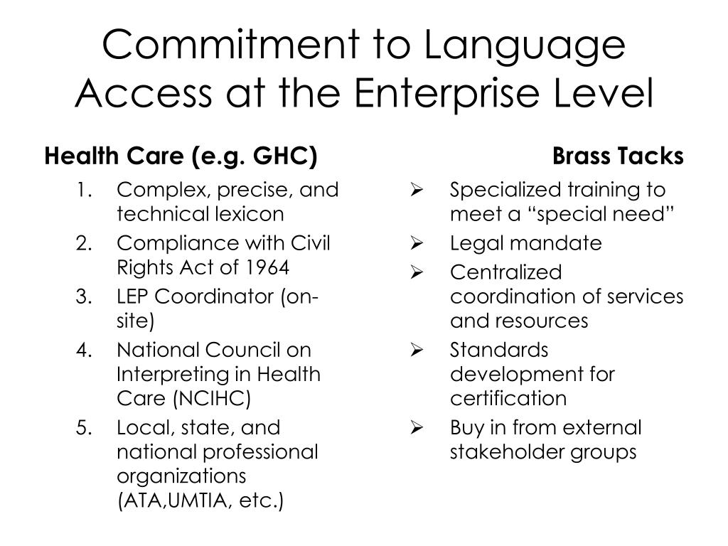 Commitment to Language Access at the Enterprise Level Health Care (e.g. GHC) Brass Tacks Specialized training to meet a “special need” Legal mandate Centralized coordination of services and resources Standards development for certification Buy in from external stakeholder groups • Complex, precise, and technical lexicon • Compliance with Civil Rights Act of 1964 • LEP Coordinator (on-site) • National Council on Interpreting in Health Care (NCIHC) • Local, state, and national professional organizations (ATA,UMTIA, etc.)