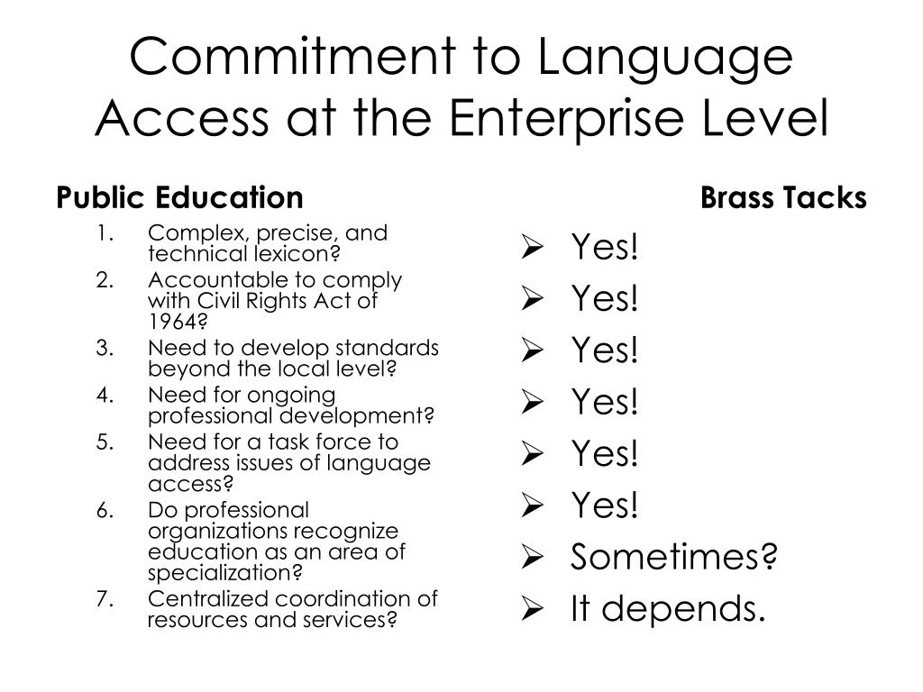 Commitment to Language Access at the Enterprise Level Public Education Brass Tacks Yes! Yes! Yes! Yes! Yes! Yes! Sometimes? It depends. • Complex, precise, and technical lexicon? • Accountable to comply with Civil Rights Act of 1964? • Need to develop standards beyond the local level? • Need for ongoing professional development? • Need for a task force to address issues of language access? • Do professional organizations recognize education as an area of specialization? • Centralized coordination of resources and services?