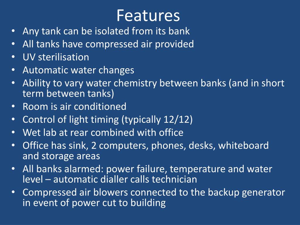 Features • Any tank can be isolated from its bank • All tanks have compressed air provided • UV sterilisation • Automatic water changes • Ability to vary water chemistry between banks (and in short term between tanks) • Room is air conditioned • Control of light timing (typically 12/12) • Wet lab at rear combined with office • Office has sink, 2 computers, phones, desks, whiteboard and storage areas • All banks alarmed: power failure, temperature and water level – automatic dialler calls technician • Compressed air blowers connected to the backup generator in event of power cut to building