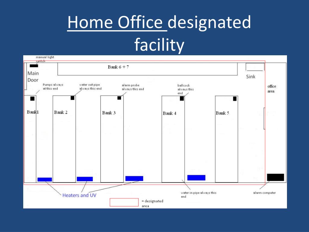 Marine facility • Approx. 50K litre recirculating system with regular fresh sea water deliveries • Two large (10K + litre) systems that are semi closed from main recirculating system and be fully isolated • Modular approach allowing hundreds of smaller tanks to receive consistent high water quality • Home Office designated facility