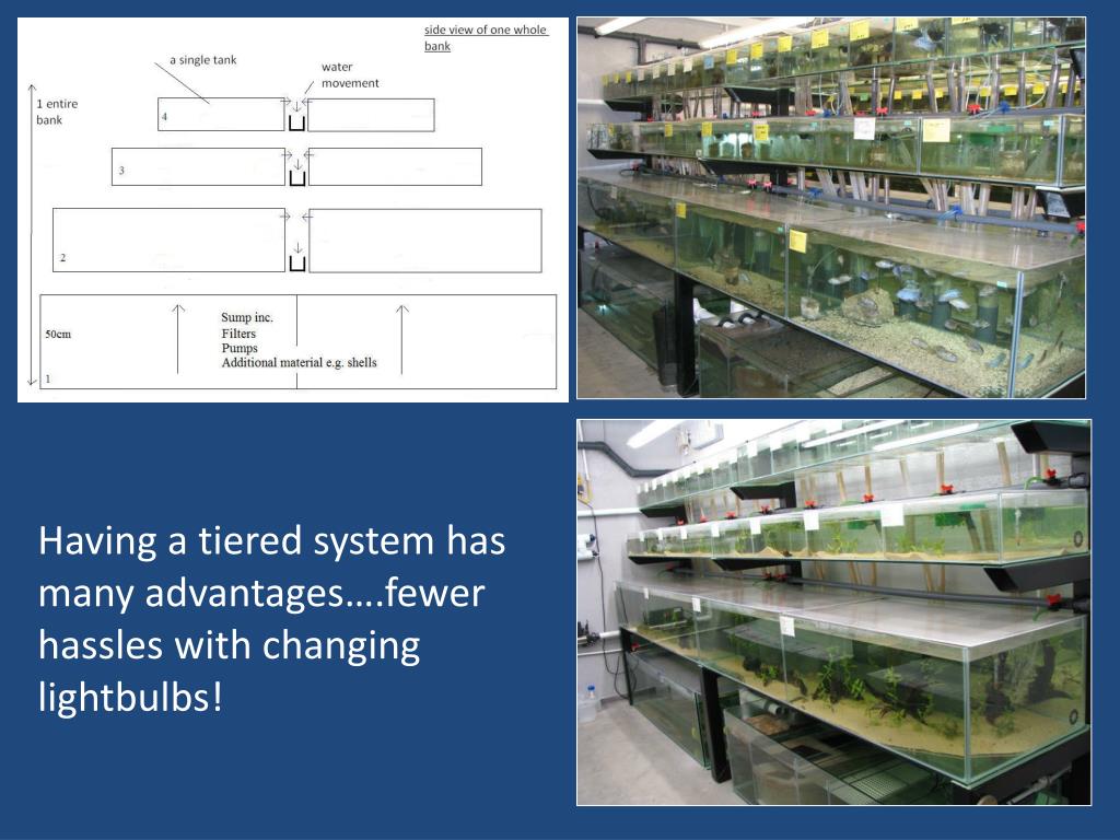 Tiered banks • Each full tiered bank has approx. 4300 litres • Tiered banks have 4 levels • Level 1 = Sumps – pumps/filters/alarms/ (4 x 400 litre tanks) • Level 2 = 8 x 195 litre tanks • Level 3 = 16 x 30 litre tanks • Level 4 = 32 x 9 litre tanks • ½ tiered bank against wall and exactly half of 1 full tiered bank