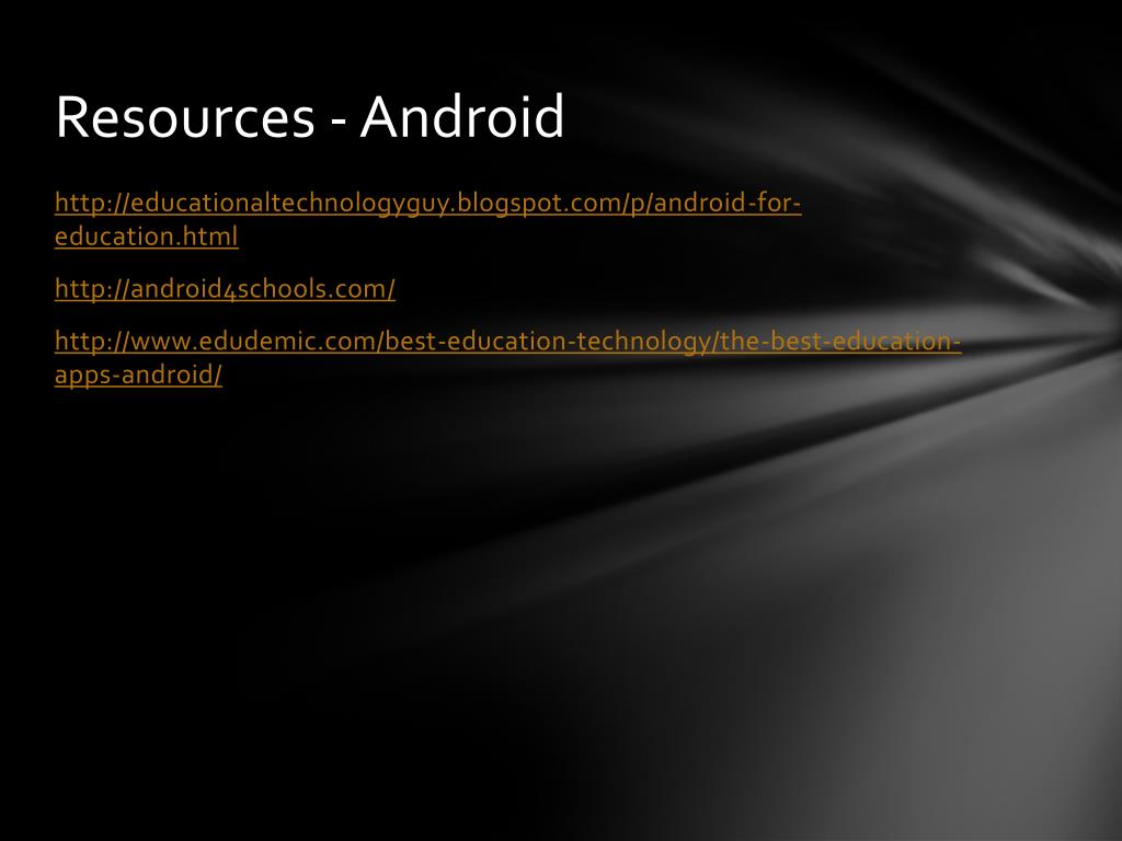 Resources - Android • http://educationaltechnologyguy.blogspot.com/p/android-for-education.html • http://android4schools.com/ • http://www.edudemic.com/best-education-technology/the-best-education-apps-android/
