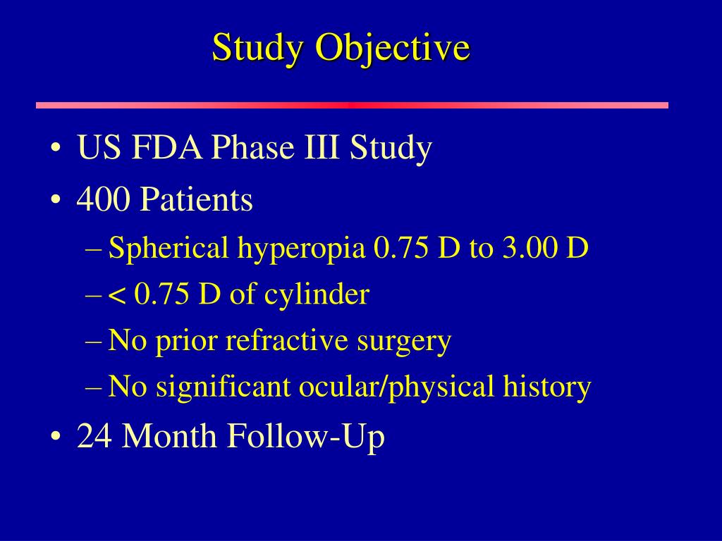 Study Objective • US FDA Phase III Study • 400 Patients • Spherical hyperopia 0.75 D to 3.00 D • < 0.75 D of cylinder • No prior refractive surgery • No significant ocular/physical history • 24 Month Follow-Up