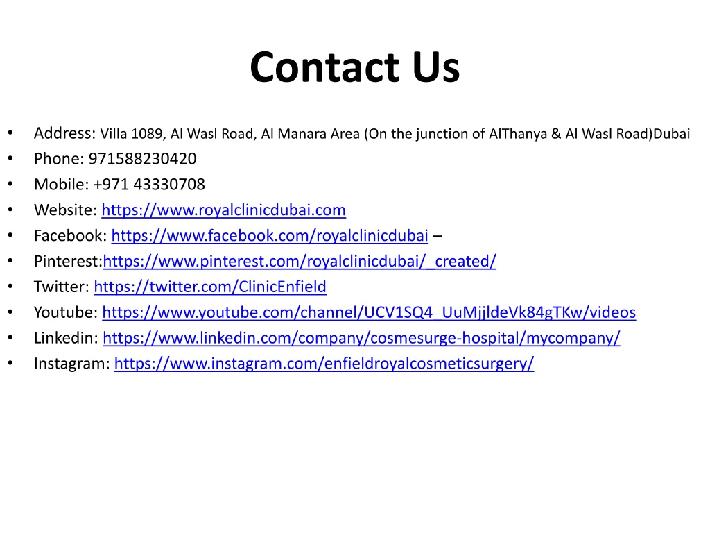Contact Us • Address: Villa 1089, Al Wasl Road, Al Manara Area (On the junction of AlThanya & Al Wasl Road)Dubai • Phone: 971588230420 • Mobile: +971 43330708 • Website: https://www.royalclinicdubai.com • Facebook: https://www.facebook.com/royalclinicdubai – • Pinterest:https://www.pinterest.com/royalclinicdubai/_created/ • Twitter: https://twitter.com/ClinicEnfield • Youtube: https://www.youtube.com/channel/UCV1SQ4_UuMjjldeVk84gTKw/videos • Linkedin: https://www.linkedin.com/company/cosmesurge-hospital/mycompany/ • Instagram: https://www.instagram.com/enfieldroyalcosmeticsurgery/