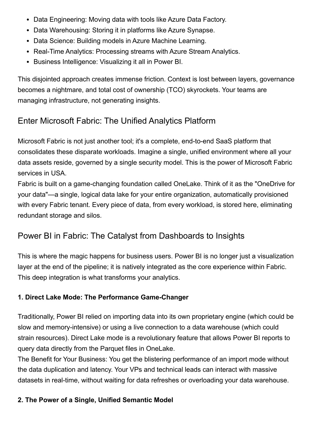 Data Engineering: Moving data with tools like Azure Data Factory. Data Warehousing: Storing it in platforms like Azure Synapse. Data Science: Building models in Azure Machine Learning. Real-Time Analytics: Processing streams with Azure Stream Analytics. Business Intelligence: Visualizing it all in Power BI. This disjointed approach creates immense friction. Context is lost between layers, governance becomes a nightmare, and total cost of ownership (TCO) skyrockets. Your teams are managing infrastructure, not generating insights. Enter Microsoft Fabric: The Unified Analytics Platform Microsoft Fabric is not just another tool; it's a complete, end-to-end SaaS platform that consolidates these disparate workloads. Imagine a single, unified environment where all your data assets reside, governed by a single security model. This is the power of Microsoft Fabric services in USA. Fabric is built on a game-changing foundation called OneLake. Think of it as the "OneDrive for your data"—a single, logical data lake for your entire organization, automatically provisioned with every Fabric tenant. Every piece of data, from every workload, is stored here, eliminating redundant storage and silos. Power BI in Fabric: The Catalyst from Dashboards to Insights This is where the magic happens for business users. Power BI is no longer just a visualization layer at the end of the pipeline; it is natively integrated as the core experience within Fabric. This deep integration is what transforms your analytics. 1. Direct Lake Mode: The Performance Game-Changer Traditionally, Power BI relied on importing data into its own proprietary engine (which could be slow and memory-intensive) or using a live connection to a data warehouse (which could strain resources). Direct Lake mode is a revolutionary feature that allows Power BI reports to query data directly from the Parquet files in OneLake. The Benefit for Your Business: You get the blistering performance of an import mode without the data duplication and latency. Your VPs and technical leads can interact with massive datasets in real-time, without waiting for data refreshes or overloading your data warehouse. 2. The Power of a Single, Unified Semantic Model