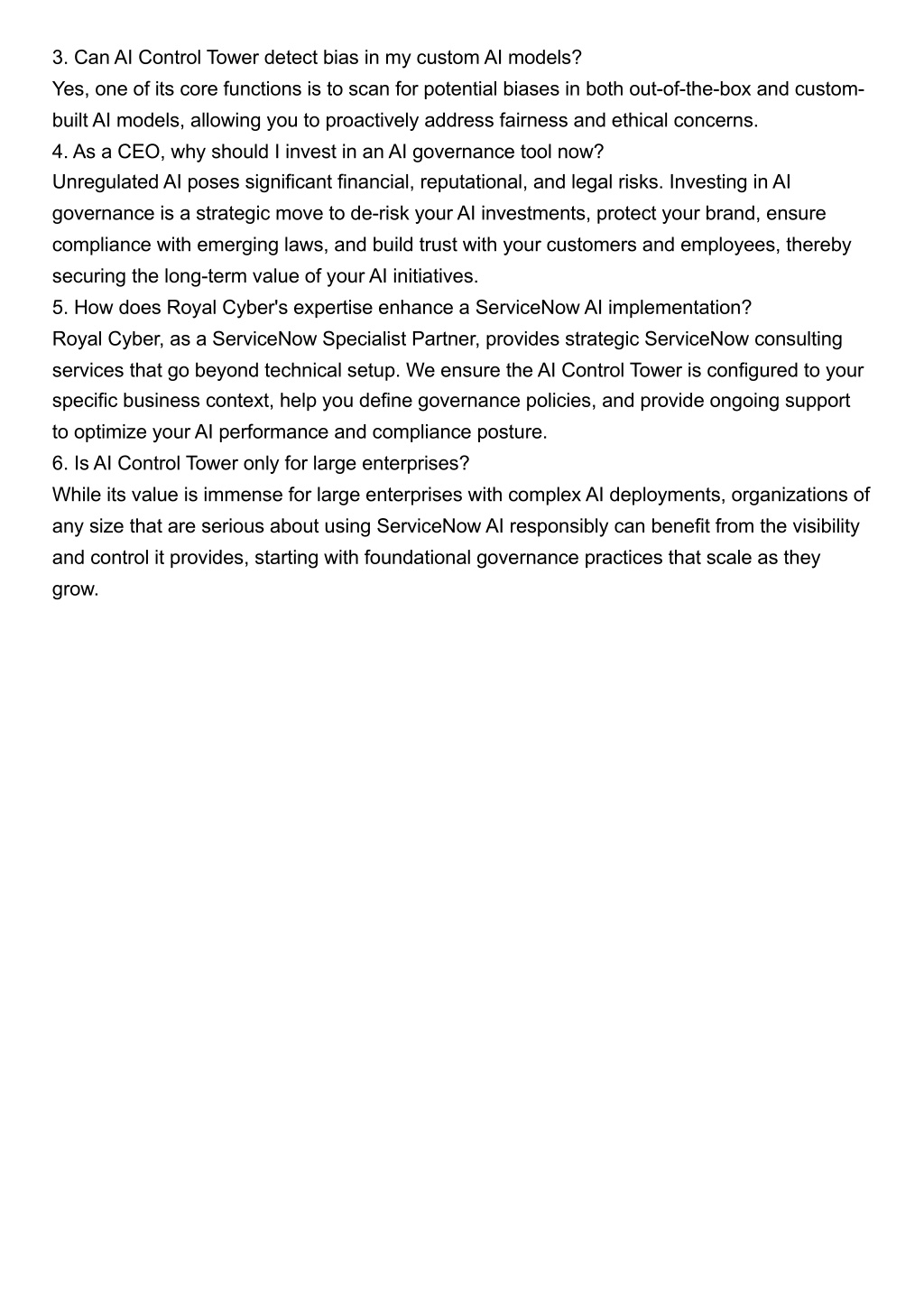3. Can AI Control Tower detect bias in my custom AI models? Yes, one of its core functions is to scan for potential biases in both out-of-the-box and custom- built AI models, allowing you to proactively address fairness and ethical concerns. 4. As a CEO, why should I invest in an AI governance tool now? Unregulated AI poses significant financial, reputational, and legal risks. Investing in AI governance is a strategic move to de-risk your AI investments, protect your brand, ensure compliance with emerging laws, and build trust with your customers and employees, thereby securing the long-term value of your AI initiatives. 5. How does Royal Cyber's expertise enhance a ServiceNow AI implementation? Royal Cyber, as a ServiceNow Specialist Partner, provides strategic ServiceNow consulting services that go beyond technical setup. We ensure the AI Control Tower is configured to your specific business context, help you define governance policies, and provide ongoing support to optimize your AI performance and compliance posture. 6. Is AI Control Tower only for large enterprises? While its value is immense for large enterprises with complex AI deployments, organizations of any size that are serious about using ServiceNow AI responsibly can benefit from the visibility and control it provides, starting with foundational governance practices that scale as they grow.