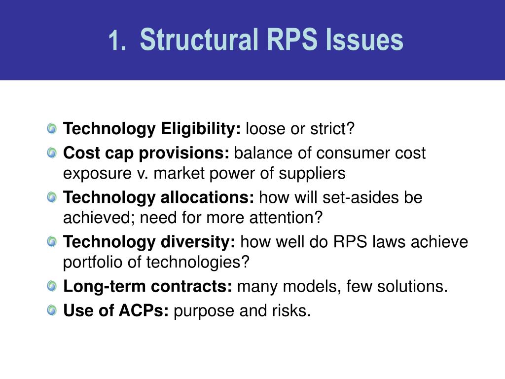 1. Structural RPS Issues • Technology Eligibility: loose or strict? • Cost cap provisions: balance of consumer cost exposure v. market power of suppliers • Technology allocations: how will set-asides be achieved; need for more attention? • Technology diversity: how well do RPS laws achieve portfolio of technologies? • Long-term contracts: many models, few solutions. • Use of ACPs: purpose and risks.