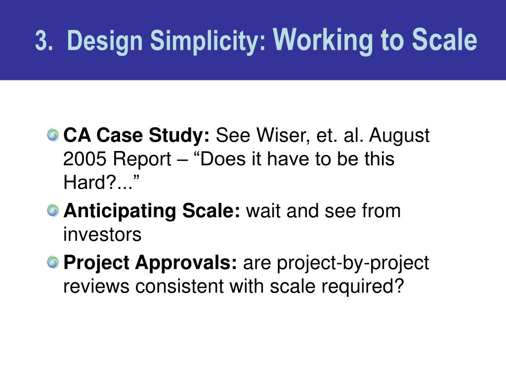 3. Design Simplicity: Working to Scale • CA Case Study: See Wiser, et. al. August 2005 Report – “Does it have to be this Hard?...” • Anticipating Scale: wait and see from investors • Project Approvals: are project-by-project reviews consistent with scale required?