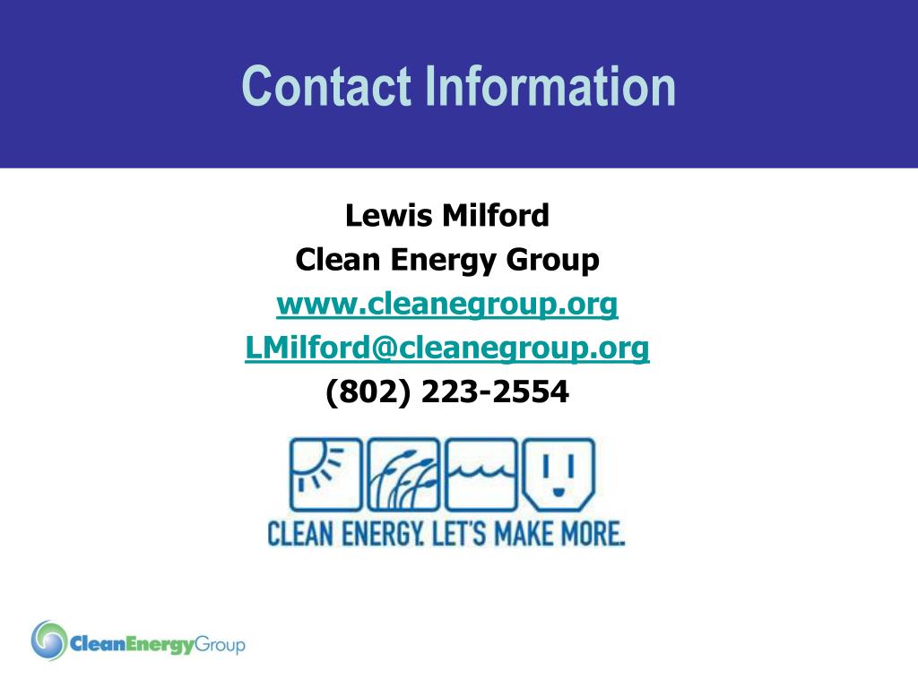 Contact Information Lewis Milford Clean Energy Group www.cleanegroup.org LMilford@cleanegroup.org (802) 223-2554