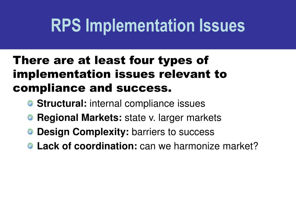 RPS Implementation Issues There are at least four types of implementation issues relevant to compliance and success. • Structural: internal compliance issues • Regional Markets: state v. larger markets • Design Complexity: barriers to success • Lack of coordination: can we harmonize market?