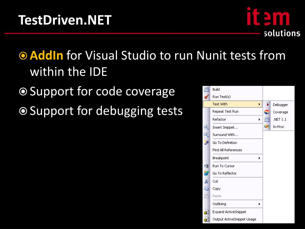 TestDriven.NET • AddIn for Visual Studio to run Nunit tests from within the IDE • Support for code coverage • Support for debugging tests