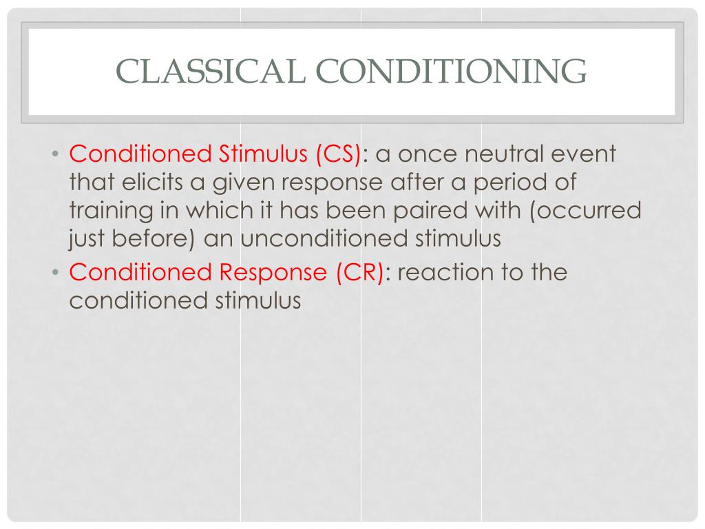 Classical Conditioning • Conditioned Stimulus (CS): a once neutral event that elicits a given response after a period of training in which it has been paired with (occurred just before) an unconditioned stimulus • Conditioned Response (CR): reaction to the conditioned stimulus