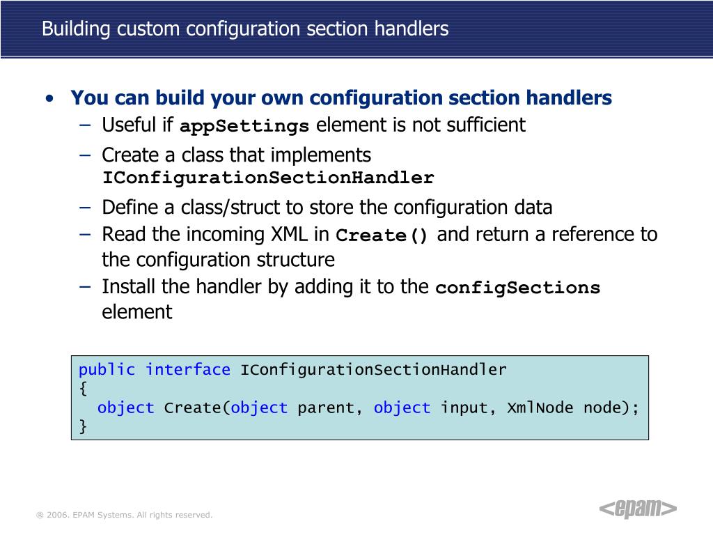 Building custom configuration section handlers • You can build your own configuration section handlers • Useful if appSettings element is not sufficient • Create a class that implements IConfigurationSectionHandler • Define a class/struct to store the configuration data • Read the incoming XML in Create() and return a reference to the configuration structure • Install the handler by adding it to the configSections element publicinterface IConfigurationSectionHandler { object Create(object parent, object input, XmlNode node); }