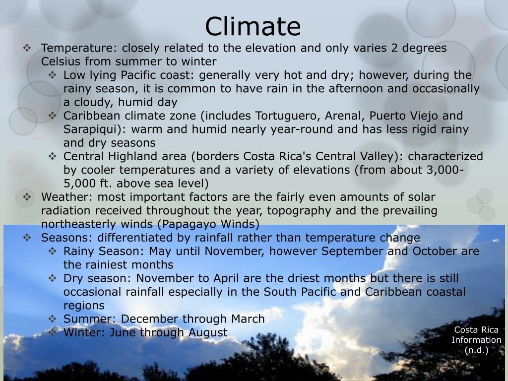 Climate • Temperature: closely related to the elevation and only varies 2 degrees Celsius from summer to winter • Low lying Pacific coast: generally very hot and dry; however, during the rainy season, it is common to have rain in the afternoon and occasionally a cloudy, humid day • Caribbean climate zone (includes Tortuguero, Arenal, Puerto Viejo and Sarapiqui): warm and humid nearly year-round and has less rigid rainy and dry seasons • Central Highland area (borders Costa Rica's Central Valley): characterized by cooler temperatures and a variety of elevations (from about 3,000-5,000 ft. above sea level) • Weather: most important factors are the fairly even amounts of solar radiation received throughout the year, topography and the prevailing northeasterly winds (Papagayo Winds) • Seasons: differentiated by rainfall rather than temperature change • Rainy Season: May until November, however September and October are the rainiest months • Dry season: November to April are the driest months but there is still occasional rainfall especially in the South Pacific and Caribbean coastal regions • Summer: December through March • Winter: June through August Costa Rica Information (n.d.)