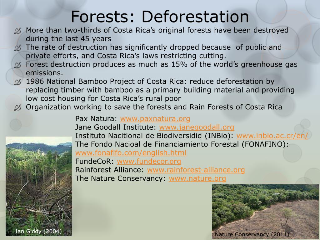 Forests: Deforestation • More than two-thirds of Costa Rica’s original forests have been destroyed during the last 45 years • The rate of destruction has significantly dropped because of public and private efforts, and Costa Rica’s laws restricting cutting. • Forest destruction produces as much as 15% of the world’s greenhouse gas emissions. • 1986 National Bamboo Project of Costa Rica: reduce deforestation by replacing timber with bamboo as a primary building material and providing low cost housing for Costa Rica’s rural poor • Organization working to save the forests and Rain Forests of Costa Rica Pax Natura: www.paxnatura.org Jane Goodall Institute: www.janegoodall.org Instituto Nacitional de Biodiversidid (INBio): www.inbio.ac.cr/en/ The Fondo Nacioal de Financiamiento Forestal (FONAFINO): www.fonafifo.com/english.html FundeCoR: www.fundecor.org Rainforest Alliance: www.rainforest-alliance.org The Nature Conservancy: www.nature.org Ian Giddy (2004) Nature Conservancy (2011)