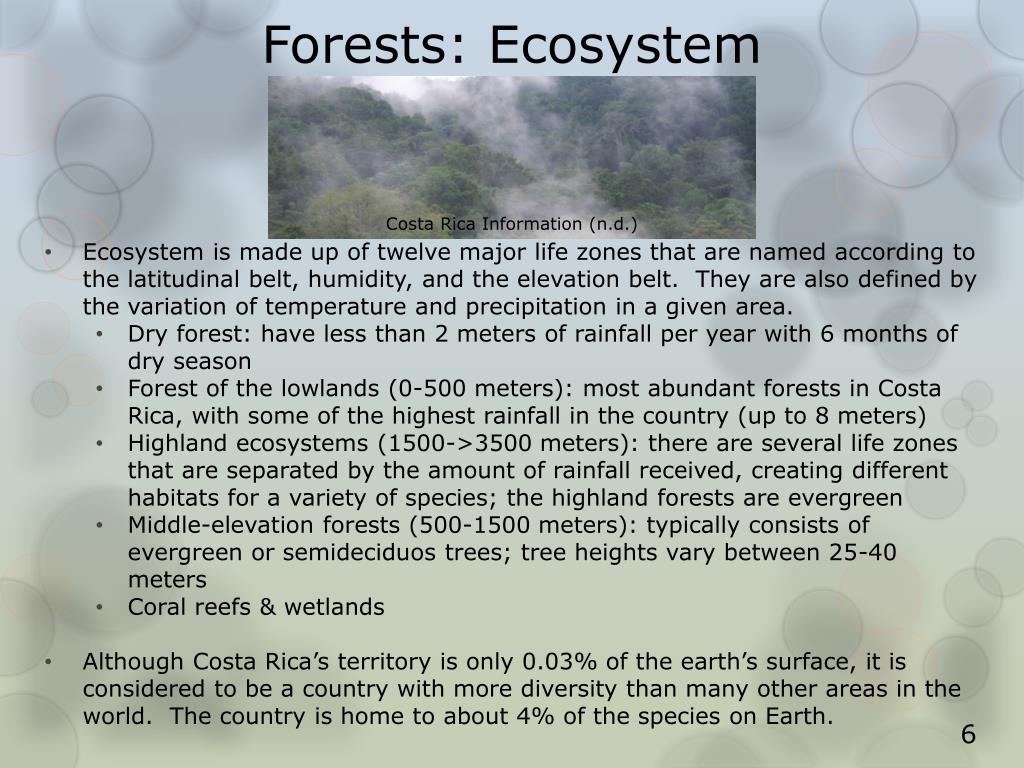 Forests: Ecosystem • Ecosystem is made up of twelve major life zones that are named according to the latitudinal belt, humidity, and the elevation belt. They are also defined by the variation of temperature and precipitation in a given area. • Dry forest: have less than 2 meters of rainfall per year with 6 months of dry season • Forest of the lowlands (0-500 meters): most abundant forests in Costa Rica, with some of the highest rainfall in the country (up to 8 meters) • Highland ecosystems (1500->3500 meters): there are several life zones that are separated by the amount of rainfall received, creating different habitats for a variety of species; the highland forests are evergreen • Middle-elevation forests (500-1500 meters): typically consists of evergreen or semideciduos trees; tree heights vary between 25-40 meters • Coral reefs & wetlands • Although Costa Rica’s territory is only 0.03% of the earth’s surface, it is considered to be a country with more diversity than many other areas in the world. The country is home to about 4% of the species on Earth. Costa Rica Information (n.d.) 6