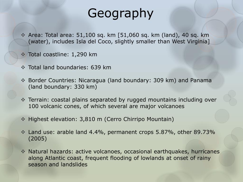 Geography Area: Total area: 51,100 sq. km [51,060 sq. km (land), 40 sq. km (water), includes Isla del Coco, slightly smaller than West Virginia] Total coastline: 1,290 km Total land boundaries: 639 km Border Countries: Nicaragua (land boundary: 309 km) and Panama (land boundary: 330 km) Terrain: coastal plains separated by rugged mountains including over 100 volcanic cones, of which several are major volcanoes Highest elevation: 3,810 m (Cerro Chirripo Mountain) Land use: arable land 4.4%, permanent crops 5.87%, other 89.73% (2005) Natural hazards: active volcanoes, occasional earthquakes, hurricanes along Atlantic coast, frequent flooding of lowlands at onset of rainy season and landslides