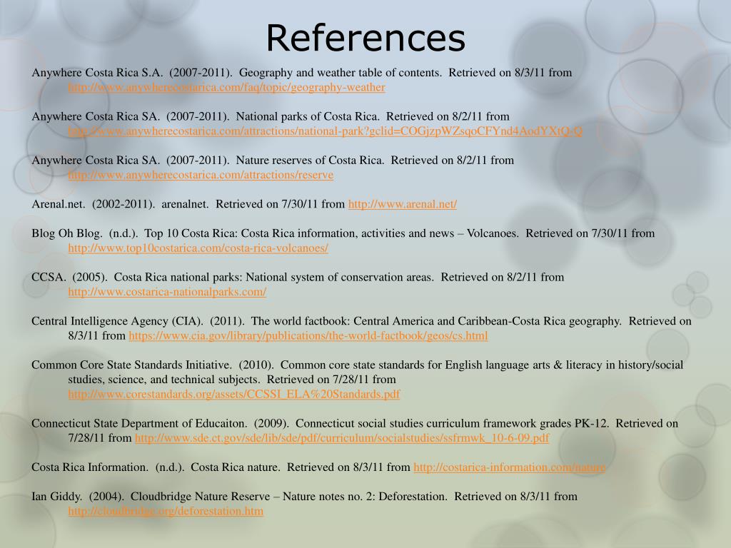 References Anywhere Costa Rica S.A. (2007-2011). Geography and weather table of contents. Retrieved on 8/3/11 from http://www.anywherecostarica.com/faq/topic/geography-weather Anywhere Costa Rica SA. (2007-2011). National parks of Costa Rica. Retrieved on 8/2/11 from http://www.anywherecostarica.com/attractions/national-park?gclid=COGjzpWZsqoCFYnd4AodYXtQ-Q Anywhere Costa Rica SA. (2007-2011). Nature reserves of Costa Rica. Retrieved on 8/2/11 from http://www.anywherecostarica.com/attractions/reserve Arenal.net. (2002-2011). arenalnet. Retrieved on 7/30/11 from http://www.arenal.net/ Blog Oh Blog. (n.d.). Top 10 Costa Rica: Costa Rica information, activities and news – Volcanoes. Retrieved on 7/30/11 from http://www.top10costarica.com/costa-rica-volcanoes/ CCSA. (2005). Costa Rica national parks: National system of conservation areas. Retrieved on 8/2/11 from http://www.costarica-nationalparks.com/ Central Intelligence Agency (CIA). (2011). The world factbook: Central America and Caribbean-Costa Rica geography. Retrieved on 8/3/11 from https://www.cia.gov/library/publications/the-world-factbook/geos/cs.html Common Core State Standards Initiative. (2010). Common core state standards for English language arts & literacy in history/social studies, science, and technical subjects. Retrieved on 7/28/11 from http://www.corestandards.org/assets/CCSSI_ELA%20Standards.pdf Connecticut State Department of Educaiton. (2009). Connecticut social studies curriculum framework grades PK-12. Retrieved on 7/28/11 from http://www.sde.ct.gov/sde/lib/sde/pdf/curriculum/socialstudies/ssfrmwk_10-6-09.pdf Costa Rica Information. (n.d.). Costa Rica nature. Retrieved on 8/3/11 from http://costarica-information.com/nature Ian Giddy. (2004). Cloudbridge Nature Reserve – Nature notes no. 2: Deforestation. Retrieved on 8/3/11 from http://cloudbridge.org/deforestation.htm